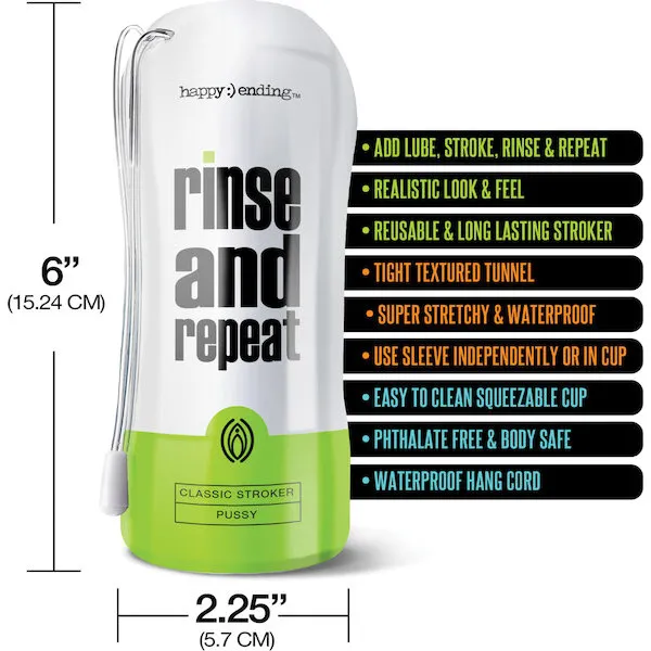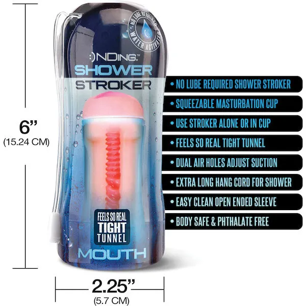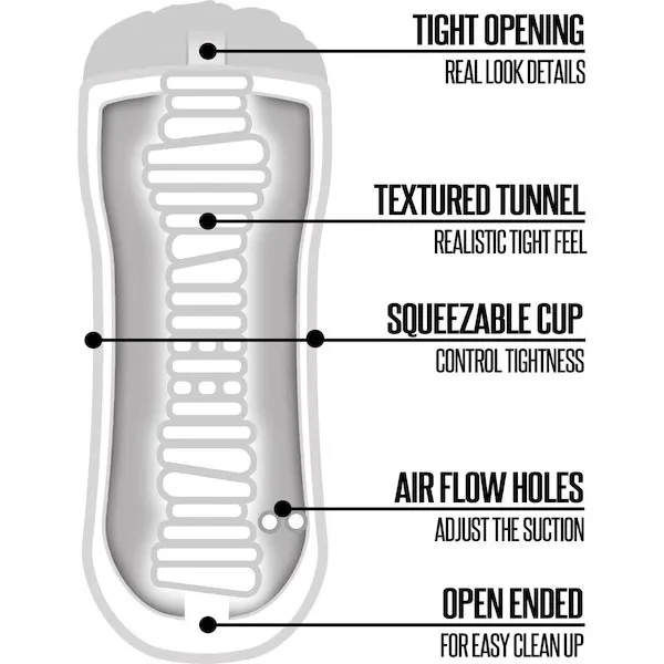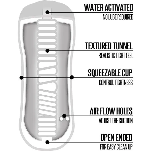 No Lube required - water activated shower stroker. Squeezable masturbation cup. Use Stroker alone or in cup. Feels so real tight tunnel. Dual air holes adjust suction. Extra long hang cord for shower. Easy clean open ended...